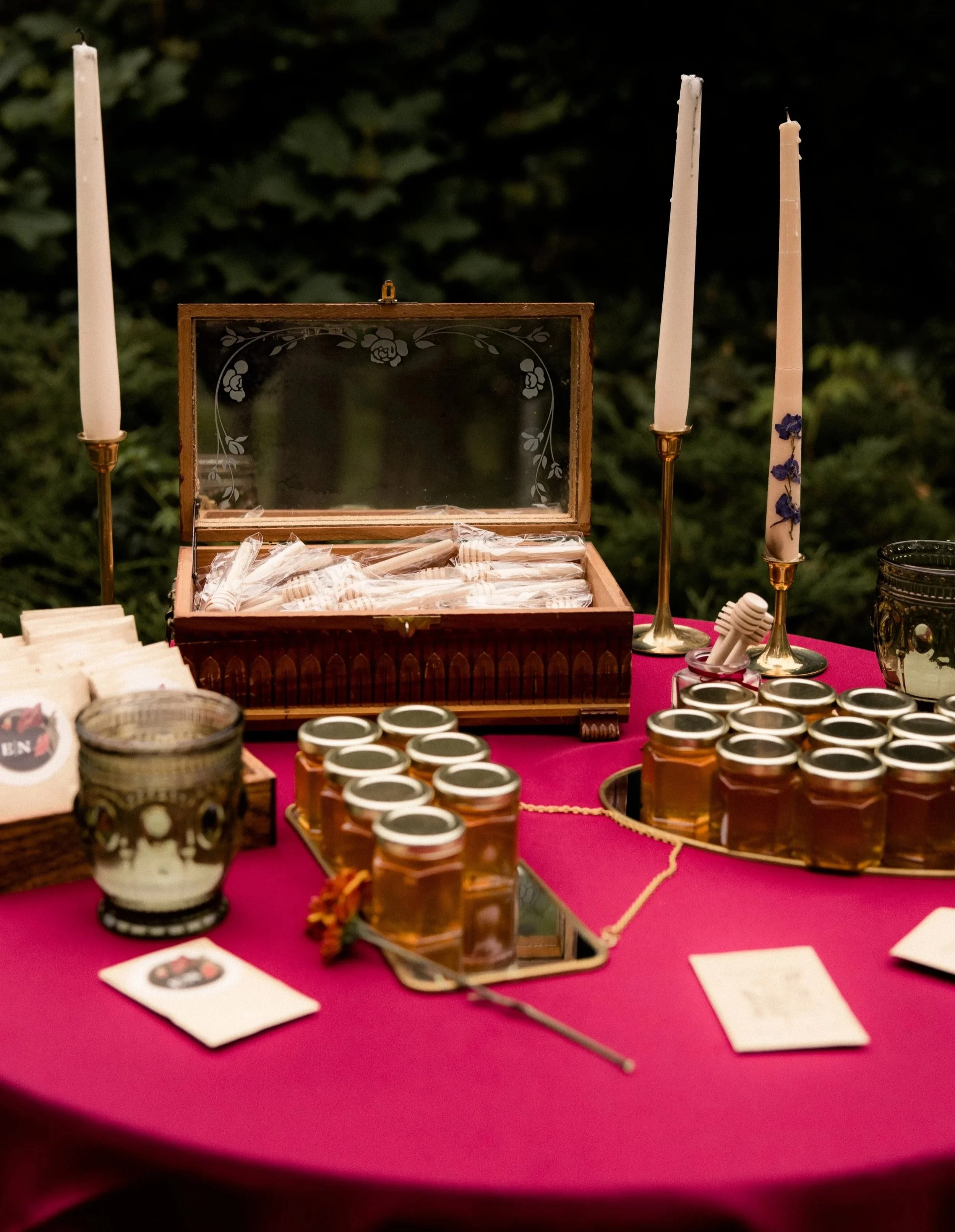We have had a few clients take this route. It’s a very unique and sweet favor! Who doesn’t love a little honey with their tea, or with their pastries? Honey is a favor that has multiple purposes in the culinary world, so it’s bound to get devoured by each guest. We once had a couple host a medieval tea party themed wedding, so they had honey as the favor to stay on brand and continue the sweet tea party at home.